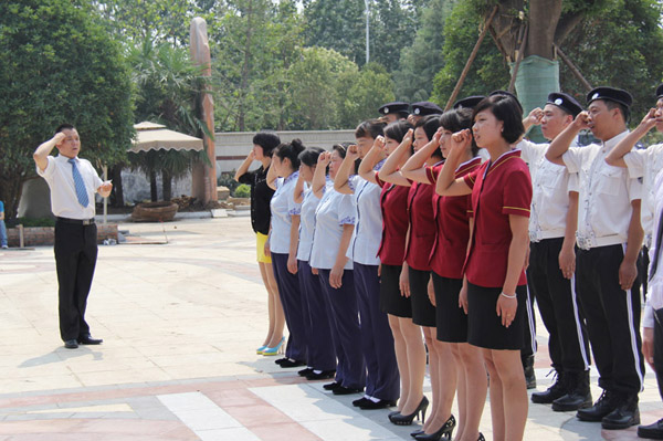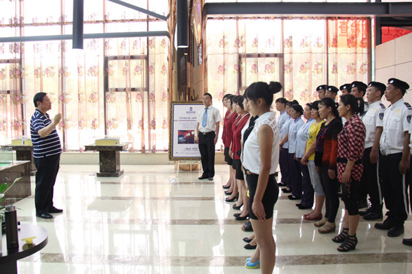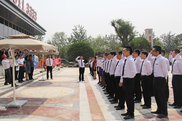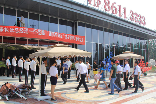 随后冯董一行在售楼部对营销中心的销售和物业公司的服务准备工作进行了现场验收。营销中心销售人员向董事长介绍了项目区位、项目沙盘、户型设计,并进行了实时销售说辞演练。随后在休息的间歇,董事长和集团领导一起参加了营销中心团队、物业公司团队的表决心检阅仪式,烈日下激情的宣誓打动了领导也令在场的所有人为之振奋动容。最后董事长、张总及集团领导对营销中心销售人员、物业公司服务人员逐一进行了业务技能、服务水平检查指导。完毕后,张总、冯董分别在总结集会上讲话,对他们的辛勤付出表示肯定和衷心感谢,同时也对他们工作中出现的问题和不足提出了高标准严要求。