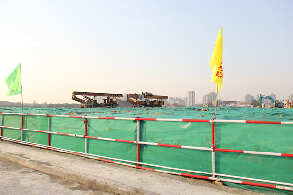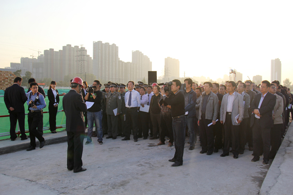 冬季来临,为了响应西安市防污减霾、减少工地环境污染号召,10月21日下午,由西安市高新区管委会组织的茶张村拆迁安置项目出土工地规范管理现场会在国宾中央区工地举行。高新区管委会副主任李小峰携相关局领导及高新区建筑工地扬尘污染防治工作包抓中层干部、高新区41家建筑方、施工方及清运资质车队负责人等共约120人参加了此次现场会,同时会议也吸引了西安电视台、西安广播电台等媒体的到来。