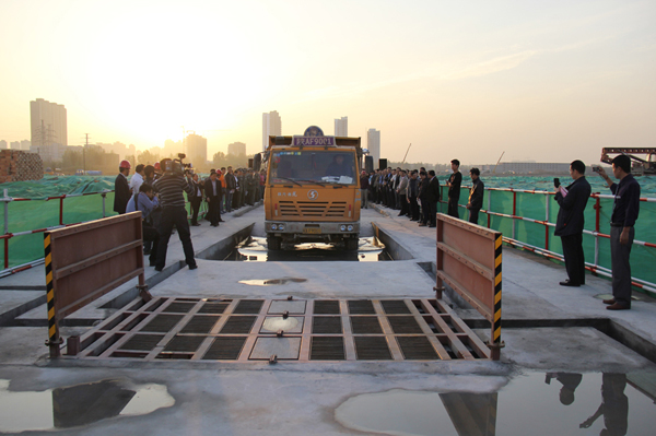 国宾中央区项目工地作为治污减霾标杆模范,工地围挡严实,场内道路全部进行了硬化,渣土堆料全部被严密覆盖。会议现场演示了拉土车出场流程:所有渣土车在出场前,首先要经过2米长的刮泥挡,将车轮、车身上大块的泥土刮下来,随后进入近1米深的蓄水池,将车上剩余的泥土润湿,最后由大型自动冲洗设备将泥土冲掉,实现无土出场,现场演示赢得了阵阵掌声。