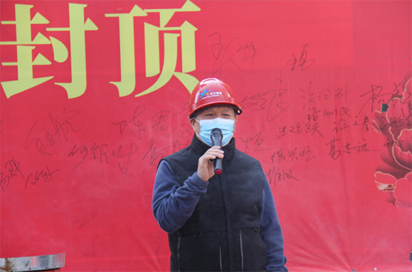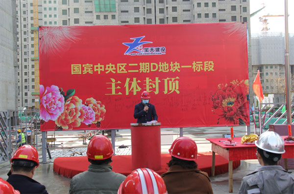 宝天集团总经办主任王跃进先生,宝天集团总工办陈君孝先生,建司管理者代表余恒先生,建司D地块1标段执行项目经理杨普江等人先后做了主题发言,对国宾中央区二期D地块1标段胜利封顶表示祝贺,并衷心祝愿项目顺利建成交付。建司在场全体管理人员备受鼓舞,精神振奋,誓为业主交出一份满意答卷,为宝天再树一座丰碑而奋力向前!