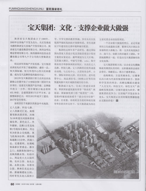 2012年宝天集团投巨资又在西安西高新核心位置开发了大型综合体--国宾中央区项目,这是宝天集团产品升级、品牌提升的又一力作。项目规划占地总面积为453.09亩,总建筑面积为173万平方米,总投资为80多亿元人民币,项目2012年底开工建设,2017年交付使用。